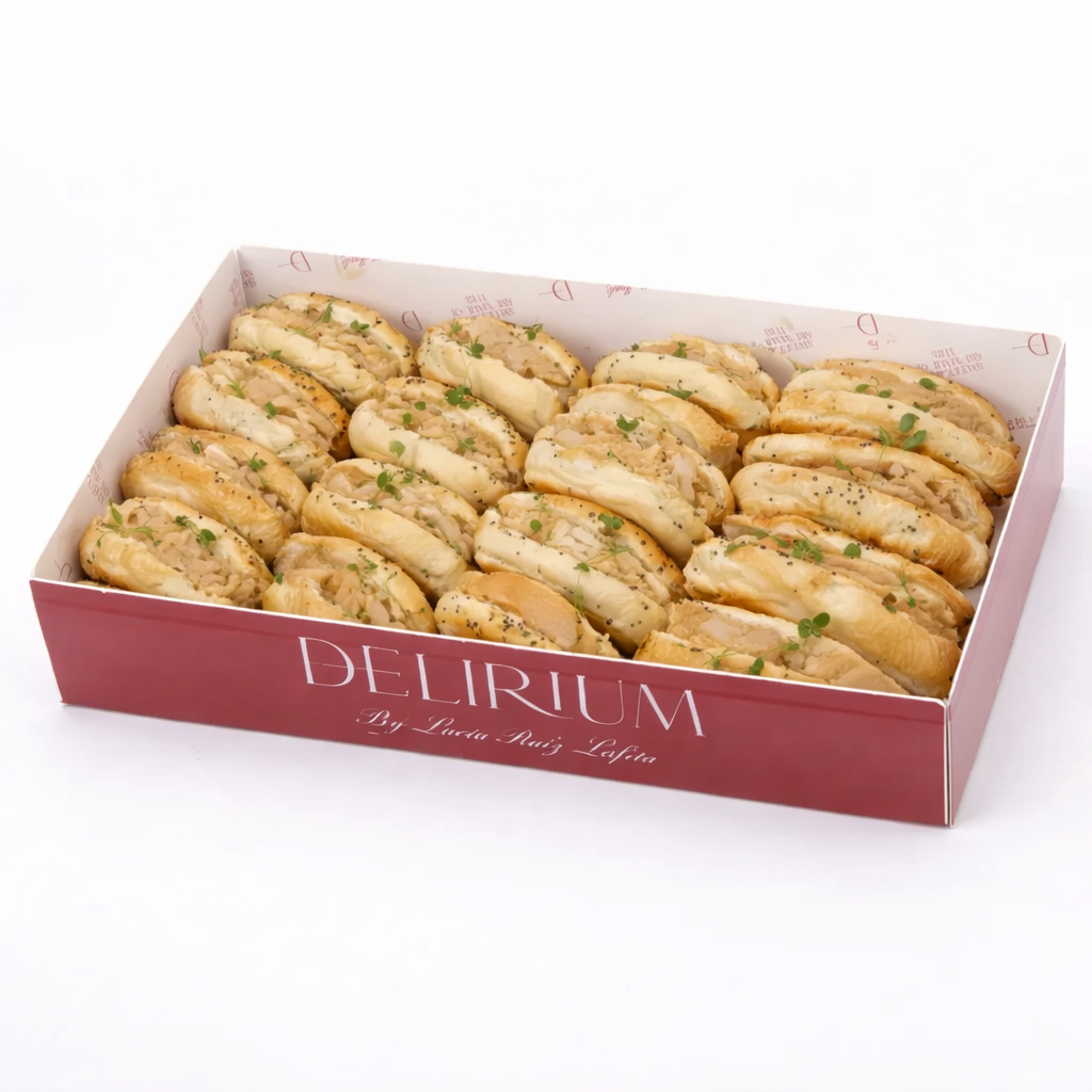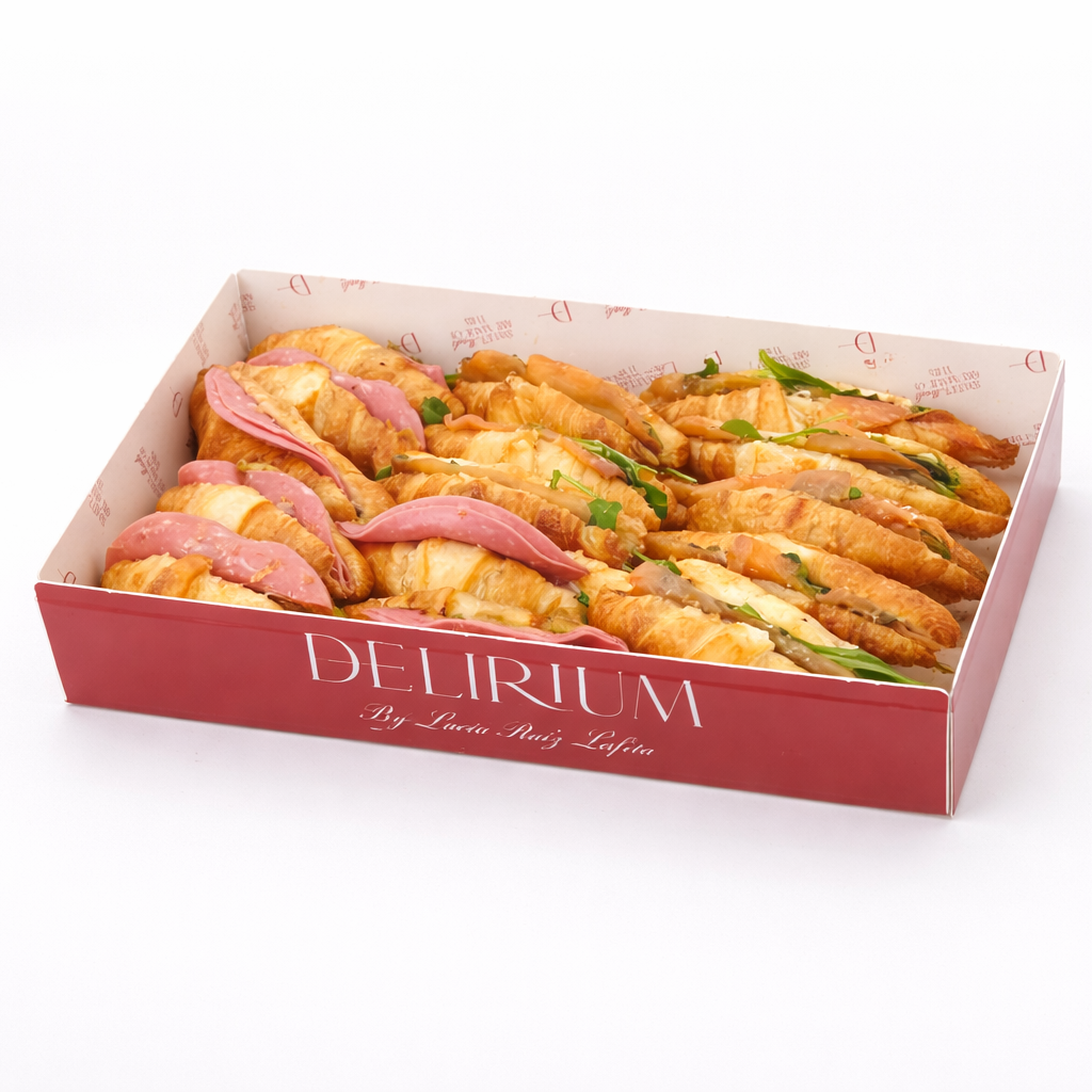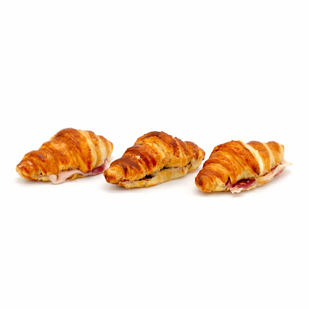 Pack de 8 mini croissants rellenos de mortadela, queso mozzarella, tomate seco y pesto
