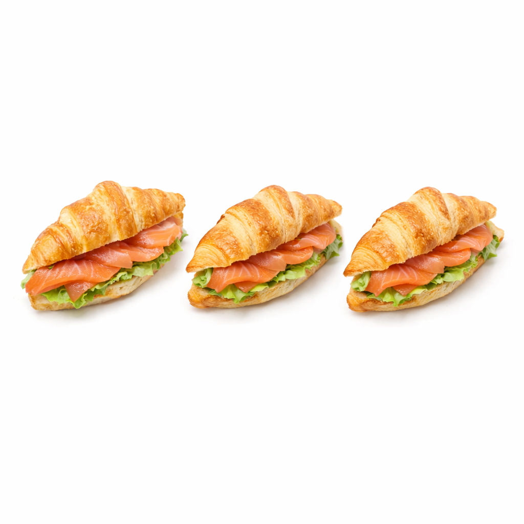 Pack de 8 mini croissants rellenos de queso crema, salmón ahumado, salsa de eneldo y lechuga