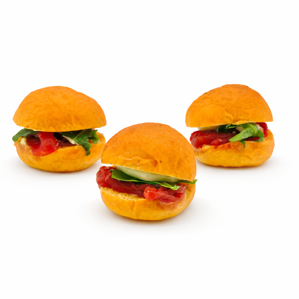 Pack de 16 micro panecillo de tomate con carpaccio, parmesano y rucula