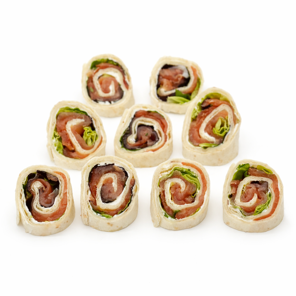Pack de 18 Mini wraps de salmón queso crema salsa de eneldo y lollo rosso