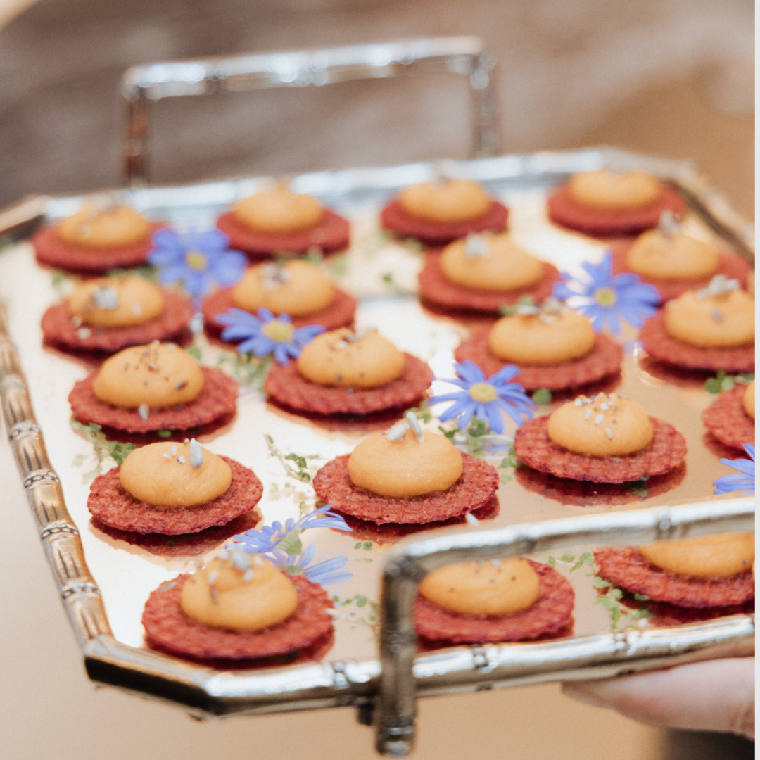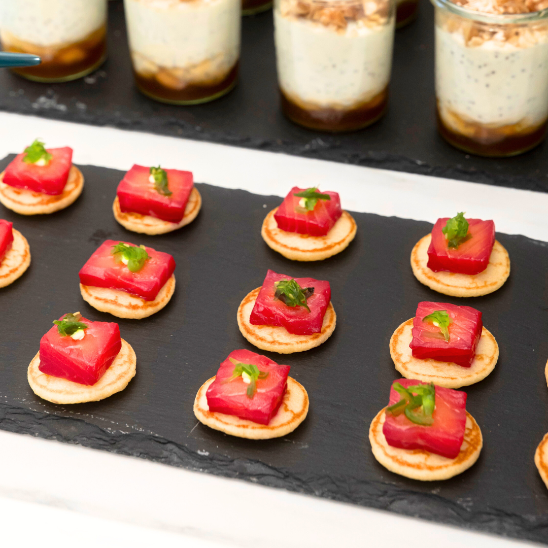 Blinis con salmón macerado en remolacha, crème fraîche y caviar de wasabi