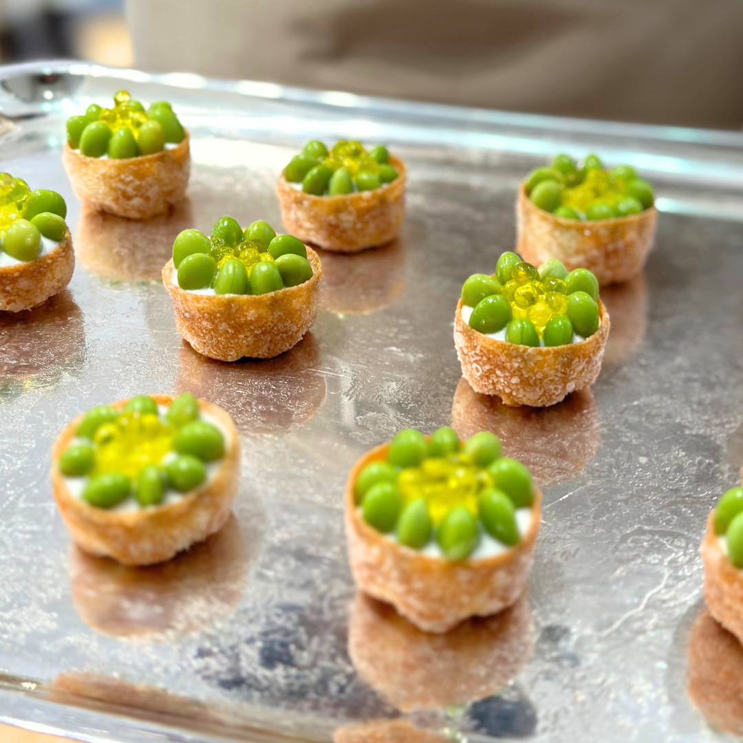Tartaleta con crema de espárragos, edamame y huevas