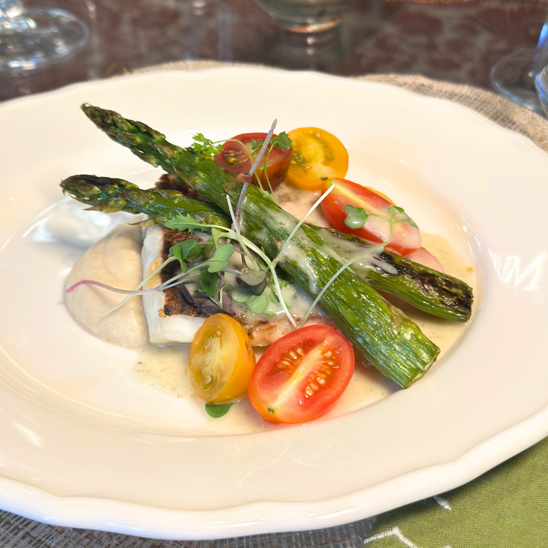 Lubina a la meunière con verduritas y puré de coliflor